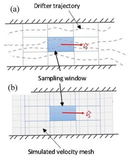 Schematic spatio-temporal window of the domain. Grey dashed lines show the schematic drifter trajectories. The velocity arrow (Vl) in (a) denotes the mean velocity of drifters inside each cell, while the velocity arrow (Vs) in (b) denotes the mean simulated velocity obtained from the model in the same time frame.