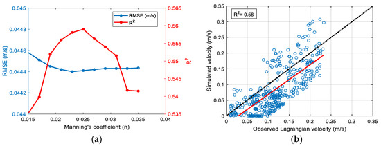 Our calibrated model was validated by comparing simulated velocities with 30% of the velocity measurements for both Eulerian and Lagrangian data. Based on the Eulerian calibration results in Section 4, the optimum Manning’s coefficient was n = 0.025. The Eulerian comparison between observed and simulated velocities is illustrated in Figure 13a. The RMSE and R2 calculated for this simulation was 0.014 m/s and 0.954, respectively, yielding a successful calibration and some improvement in model performance.