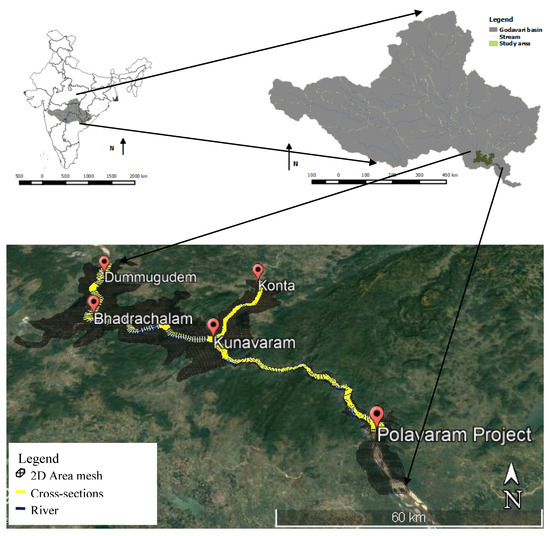 Study area location in Godavari basin from Dummugudem and konta in upstream of Godavari River till Polavaram project location with 2D flow area considered with cross-sections.