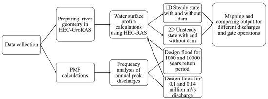 The methodology adopted for this study is shown in Figure 2. This flowchart represents the procedure for flood backwater induced calculations. The Central Water Commission (CWC) has said it has no specific "principles or guidelines" for conducting a study on the assessment of backwater flooding of dams and hydroelectric projects in the country [26]. However, few studies considering the impact of hydraulic structure on upstream areas have followed a similar approach to come up with WSE for different flood discharges.