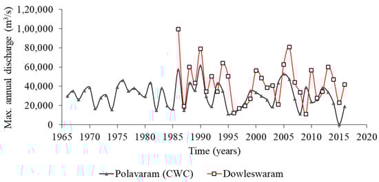 Observed peak annual discharge at Polavaram and Dowleswaram gauge.