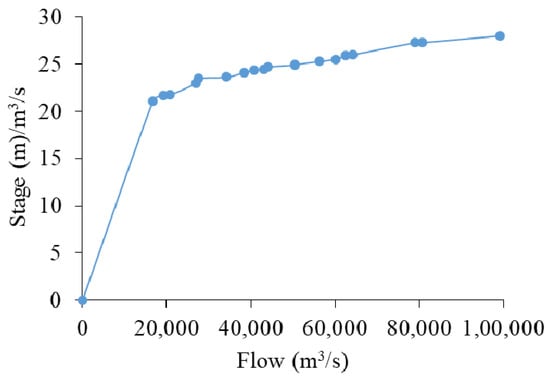 The flow data consists of boundary conditions (external and internal), as well as initial conditions. Boundary conditions are established at all open ends of the river system [32]. Upstream ends of a river system are modeled with the flow hydrograph (most common upstream boundary condition) boundary conditions. Downstream ends of the river system are modeled with the rating curve. The boundary conditions used in this study, depending on the availability of data for unsteady flow calculations, were given in Table 3. Flow hydrograph is considered as Upstream boundary condition at Dummugudem and Konta for observed discharges in the year 1986, as shown in Figure 5 and Figure 6. A rating curve is taken as a boundary condition for downstream location Polavaram, as shown in Figure 7. For the present study, the momentum equation (Equations (4) and (5)) is applied on Sabari–Sileru rivers confluence at Kunta and Sabari - Godavari rivers confluence at Kunavaram. A blow-up of water surface profile obtained using momentum equation corresponding to discharge predicted at 1000 and 10,000 years at Kunavaram junction.