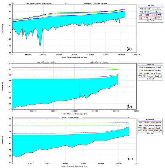 Water surface elevation for 1000 and 10,000 years discharge considering Polavaram and Dowleswaram data from (a) Polavaram to Dummugudem (b) Kunnavaraam to Saberi along river Saberi and (c) Konta to Sileru.
