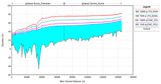 Water surface elevation for 1000 and 10,000 years discharge (considering discharge data at Dowleswaram and corresponding water levels at Polavaram) from Polavaram to Dummugudem.