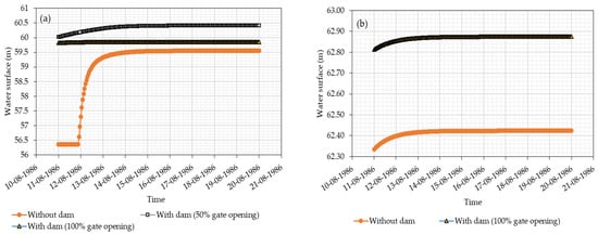 2D unsteady flow simulated for (a) 0.10 million m3/s with and without dam (b) 0.14 million m3/s discharge with and without a dam.
