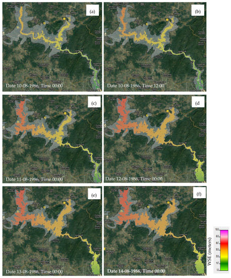 Simulated inundation map for a period of 10th –14th August 1986 without a dam. (a) and (b) shows inundation on 10th August 1986 at gap of 12 h. (c), (d), (e) and (f) shows inundation from 11th to 14th August at 00:00 hours.