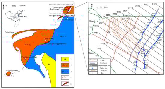 The Sanshandao gold mine (Figure 1) is located on the east coast of China adjacent to the Bohai Sea. In terms of tectonics, the study area is located at the junction between the Tan-Lu fault and the Jiyang depression []. Most of the Sanshandao-Cangshang fracture was buried by Quaternary sediment, and now there is only a partial outcrop. The fracture, which stretches into the Bohai sea, starts at the town of Sanshandao in the northeast and ends at the village of Panjiawuzi, but there is also an outcrop near Furong island. The length of the fracture is about 12 km, and the width is 50–200 m, forming an “S” shape on the surface. The overall strike of the fracture (facing a southeasterly direction with a dip angle of 45°–75°) is about 40°. This fracture controls three gold deposits: the Sanshandao gold mine, Xinli gold mine, and Cangshang gold mine. The Sanshandao gold mine—the study area—is located in the northeastern part of the Sanshan-Cangshang fracture. In the study area, there are three controlling fractures, which we call F1, F2, and F3 (Figure 1).