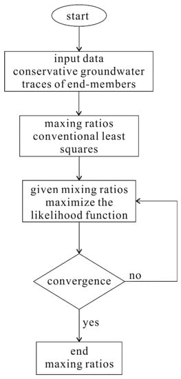 where ci,j is the concentration of parameter j for water site i, fi,k is the fraction (or mixing ratios) of end-members k that is associated with water site i, Ej,k is the end-member concentration for variable j and end-member k, and is the error. This algorithm was programed using MIX software, which was created by Carrera. This algorithm mainly comprises four steps (Figure 2): (1) assuming that the concentrations of end-members are known, the mixing proportions are identified using conventional least squares (initialization); (2) given the initial mixing proportions, the maximum likelihood function is used to estimate the expected values of the samples and the end-member concentrations; (3) given the expected values of the samples and the end-member concentrations from (2), the maximum likelihood method is used again to calculate the mixing proportions; and (4) the algorithm does not end until there is convergence and no residual reduction between step 2 and step 3. In the traditional EMMA method, there is a limitation: when water sources flow into a system, hydrochemical evolution is neglected. However, because it acknowledges the uncertainty of end-member concentrations, the method presented in this paper has two advantages. First, it can improve the estimation of actual end-member concentrations. Second, and most importantly, it can improve the accuracy of the calculated mixing ratios.