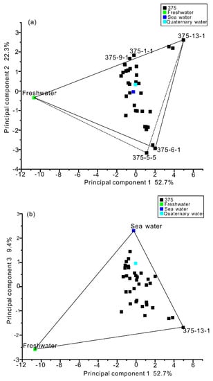 A principal component analysis (PCA) combined with a hierarchical cluster analysis (HCA) was performed on the variables, including K+, Na+, Ca2+, Mg2+, Cl−, SO42+, HCO3−, pH, EC, and the TDSes of 38 water samples collected from the −375-m sublevel. The results, including the water sites plotted from the PCA, are demonstrated in Figure 3. Principal components 1, 2 and 3 accounted for 52.7%, 22.3%, and 9.4%, respectively, of total explained variance. These three principal components explained 84.4% of the hydrochemistry information. In Figure 3, two extreme-value points (end-members) can clearly be seen (freshwater and 375-13-1), as can three potential extreme-value points (approximate end-members) (seawater, 375-6-1, and 375-5-5) [].