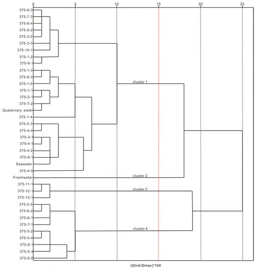 The three potential end-members were then estimated using an HCA, which was performed on raw data from the −375-m water samples. The HCA detected similar groups among the water samples and then produced a dendrogram (Figure 4) grouping 38 water samples into four clusters. The criterion for identifying the four groups was linkage distance, defined as [], which is a quotient of linked distance at a special point divided by the maximum distance. Combining the results from the PCA and HCA, it could be seen that there were four end-members at the −375-m sublevel. Freshwater and 375-13-1 were two of these end-members. We used prior knowledge and Figure 3b to determine that seawater was another end-member. We later chose not to include water samples 375-5-5 and 375-6-1 as end-members. With 375-5-5, there were two water samples located significantly outside the polygon that consisted of freshwater, 375-13-1, and 375-5-5. Besides, the distance between 375-5-5 to the polygon was relatively far. As with 375-5-5, the samples 375-9-1 and 375-1-1 were outside the polygon. However, they were near the line with freshwater and 375-13-1 and had a good fit with this line. This demonstrated that these two water samples were mainly composed of freshwater and 375-13-1. The results (Table 1) from analyzing the mixing ratios of 375-13-1, which were calculated afterwards, also proved this. For example, for 379-1-1, freshwater sources accounted for 31.5% and the 375-13-4 water source accounted for 59.3%, and these two end-members accounted for 90.8% of all water sources. For 375-9-1, freshwater water sources accounted for 33.1% and the 375-13-1 water source accounted for 57.0%, and these two end-members accounted for 90.1% of all water sources.