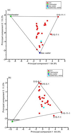 Results of the principal component analysis for water samples collected from the −510-m sublevel. (a) Plot scatters of scores of the principal component 1 and 2. (b) Plot scatters of scores of the principal component 1 and 3. These three principal components account for 89.0% of the total explained variance