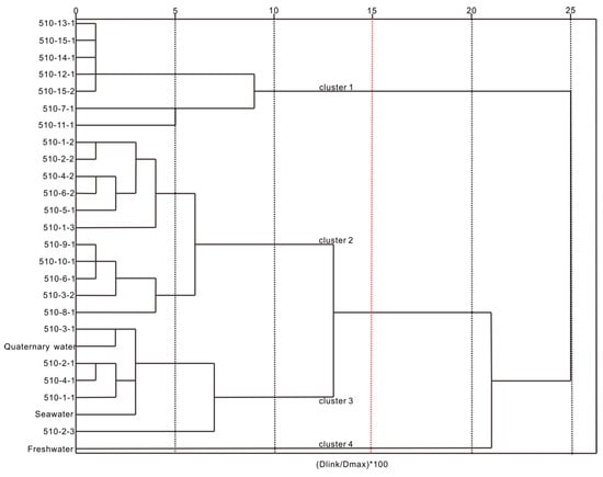 Using the same procedure as in scenario 1, PCA and HCA were performed on datasets of samples from the −510-m sublevel (demonstrated in Figure 5 and Figure 6, respectively). Principal component 1, principal component 2, and principal component 3 represented 64.8%, 13.2%, and 11.0% of total explained variance, respectively. These three principal components perfectly expressed the hydrochemical information of the datasets. We chose four extreme-value points (freshwater, seawater, 510-8-1, and 510-11-1) as end-members. As is shown in Figure 5, 510-7-1 was another extreme value point. We did not choose it as an end-member for two reasons: the HCA demonstrated that the water samples from the −510-m sublevel were divided into four clusters (Figure 6): if we had chosen 510-7-1 as an end-member, there would have been many water samples located outside of the polygon consisting of freshwater, seawater, and 510-7-1 or consisting of freshwater, 510-8-1, and 510-7-1. Thus, the 510-7-1 water sample did not represent a water source and could not be an end member.