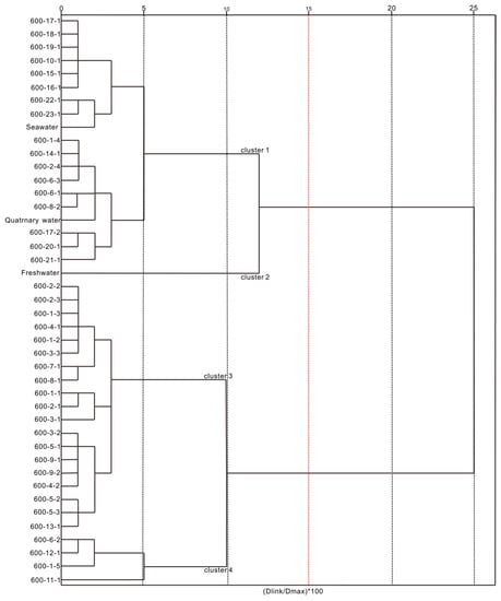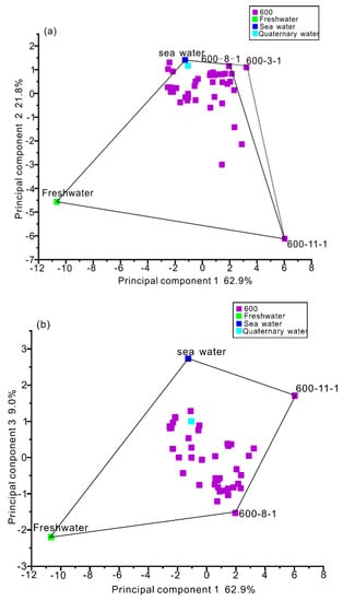 The results from the PCA are shown as water samples plotted on the first three principal components, which represented 93.7% of total explained variance in the data from the −600-m sublevel (Figure 7). Principal components 1, 2, and, 3 represented 62.9%, 21.8%, and 9.0%, respectively, of total explained variance. The HCA showed that the water samples from the −600-m sublevel were divided into four clusters. When the PCA and HCA were combined (Figure 8), freshwater, seawater, 600-8-1, and 600-11-1 were obtained as the four end-members. The sample 600-3-1 was located on the line between seawater and 600-8-1 and was near 600-8-1. This demonstrated that 600-3-1 could be represented by 600-8-1 to a large extent. Besides, in Figure 7b, it can clearly be seen that 600-3-1 was in the polygon consisting of freshwater, seawater, 600-8-1, and 600-11-1. Therefore, 600-3-1 was excluded and could not be used as an end-member.