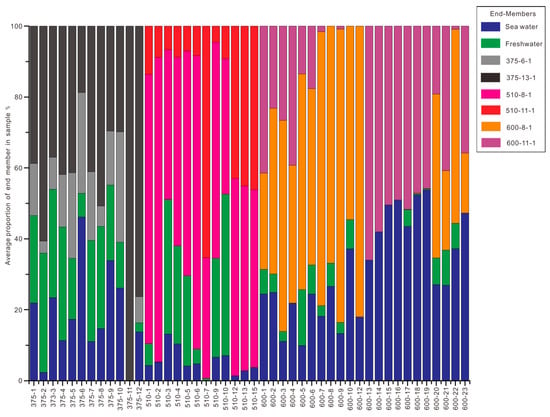 An EMMA method based on the theory of maximum likelihood was used to calculate the mixing ratios of the Xishan gold mine. Here, 38 water samples from the −375-m sublevel, 26 water samples from the −510-m sublevel, and 43 water samples from the −600-m sublevel were collected, for which the following three parameters were used, respectively: δ18O, δ2H, and Cl−. Using the above results, freshwater, seawater, 375-6-1, and 375-13-1 were selected as end-members for the −375-m sublevel; freshwater, seawater, 510-8-1, and 510-11-1 were selected as end-members for the −510-m sublevel; and freshwater, seawater, 600-8-1, and 600-11-1 were selected as end-members for the −600-m sublevel. The calculated proportions of the water samples from the Xishan gold mine are shown in Table 1, Table 2 and Table 3. According to Table 1, Table 2 and Table 3, the authors calculated the average proportions (Figure 9) of the samples at each water site. In Figure 9, it can clearly be seen that with depth, the ratios of the seawater generally increased. However, an opposite phenomenon happened with freshwater. At the −600-m sublevel, the contribution of seawater was approximately 40%, and in some water sites, the ratio was 50% or more, with freshwater contributing little to the four end-members.