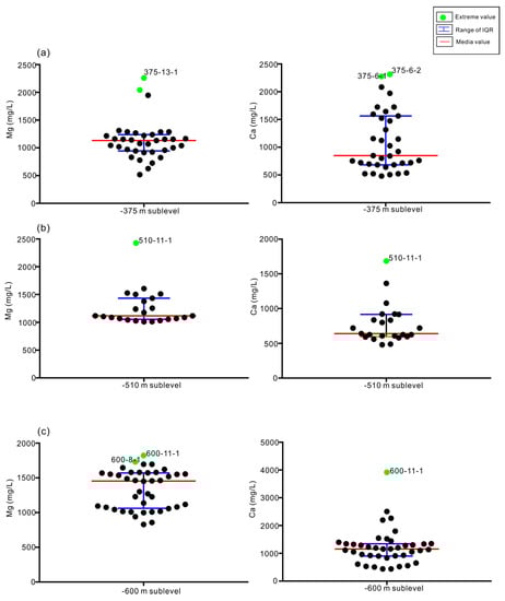 Scatterplots of the concentration values of the variables: Mg and Ca in the water samples collected from the main sublevels: (a) the −375-m sublevel, (b) −510-m sublevel, and (c) −600-m sublevel.