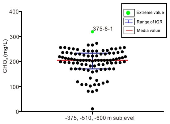 Scatterplots of the concentration values of the variables: CHO3 in the water samples collected from the −375-m sublevel, −510-m sublevel, and −600-m sublevel.