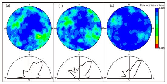 The validity of the EMMA model was further evaluated using fracture distribution law and a three-dimensional geological model. A field investigation of the fracture development characteristics of the area was valuable for studying the seepage channels and mixing ratios. Through years of measurements of the surrounding rock structures at the −375-m, −510-m, and −600-m sublevels, data from 1122 fractures (471, 391, and 260, respectively) were obtained, mainly on inclination, dip, crack spacing, and trace length. Using these data, rose diagrams of crack strike and pole contour maps of fracture inclination and dip were drawn (Figure 12). As can be seen in Figure 12, the strikes of the fractures in the three sublevels were mainly in a northeasterly direction and secondly in a northwesterly direction. These strikes were 15°–25° and 300°–320°, respectively. Moreover, there were a few fissure zones with an orientation angle between 270° and 280°. In Figure 12, it can be seen that the tendency was stronger in the second and fourth quadrants than in the first and third quadrants. Meanwhile, the fissures oriented toward the north were consistent with the results presented by the strike graph. The dip angles of the multiple sets of fissures were larger, mostly above 60°, and were concentrated between 70° and 90°.