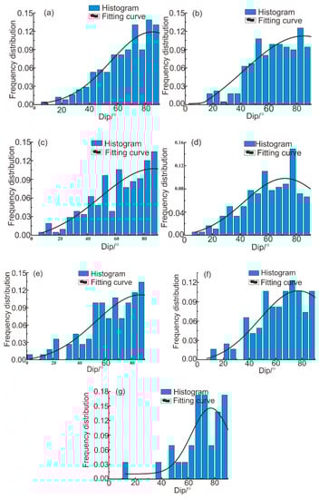Histograms and fitting curves of the frequency distribution of the fracture dip collected from the main sublevels of the Xishan gold mine: (a) the first set of fractures at the −375-m sublevel, (b) the second set of fractures at the −375-m sublevel, (c) the first set of fractures at the −510-m sublevel, (d) the second set of fractures at the −510-m sublevel, (e) the first set of fractures at the −600-m sublevel, (f) the second set of fractures at the −375-m sublevel, (g) and the third set of fractures at the −375-m sublevel.