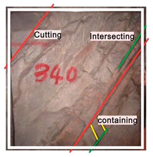 The window method was used to estimate the trace length of the fissure. As is shown in Figure 15, this method is based on relationships that include cutting, intersection, and containment in terms of the boundary of the window. This method has the advantages of flexibility and a large number of samples []. After analyzing the dozens of statistical windows in the mine, the average trace length of fissures was found to be 0.8 m. The trace length was assumed to obey a negative exponential distribution []. In Figure 16, it can be seen that the crack spacing more or less fit a log-normal distribution. The two groups of crack tracings at the −375-m sublevel were 0.113 m and 0.123 m; the two groups of dip angles at the −510-m sublevel were 0.151 m and 0.135 m; and the three groups of dip angles at the −600-m sublevel were 0.134 m, 0.13 m, and 0.09 m.