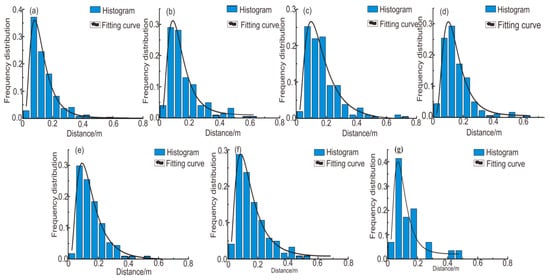 Fitting curves of the frequency distribution of fracture spacing collected from the main sublevels at the Xishan gold mine: (a) the first set of fractures at the −375-m sublevel, (b) the second set of fractures at the −375-m sublevel, (c) the first set of fractures at the −510-m sublevel, (d) the second set of fractures at the −510-m sublevel, (e) the first set of fractures at the −600-m sublevel, (f) the second set of fractures at the −375 m sublevel, (g) and the third set of fractures at the −375-m sublevel.