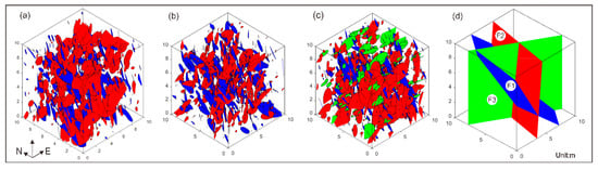 Three-dimensional network models of fractures of the three sublevels and a schematic map of the faults in the mining area: (a) the −375-m sublevel; (b) −510-m sublevel; and (c) −600-m sublevel. (d) schematic map of the faults in the mining area. Different colors represent different fracture sets and faults.