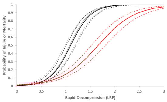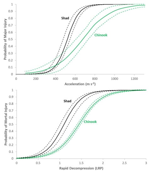 - McKinstry, C.A.; Carlson, T.J.; Brown, R.S. Derivation of a Mortal Injury Metric for Studies of Rapid Decompression of Depth-Acclimated Physostomous Fish; Pacific Northwest National Laboratory: Richland, WA, USA, 2007; PNNL-17080.