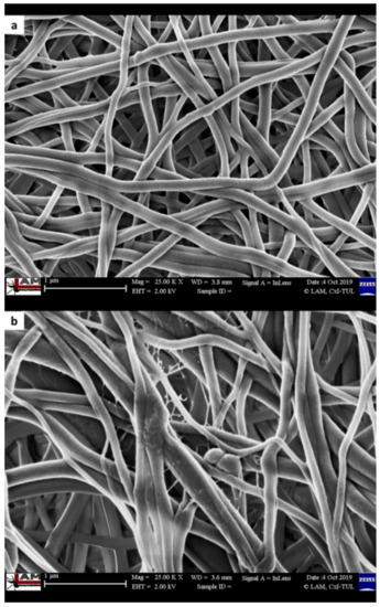 PA/PEI nanofibers (Figure 1a) had a surface density of 7–7.5 g/m2 and an average fiber diameter of ca. 100 nm. The PA/PEI-laccase sample (Figure 1b) had a noticeably different surface morphology to the smooth pristine PA/PEI nanofibers, being somewhat grainy and containing thinner fibrous structures.