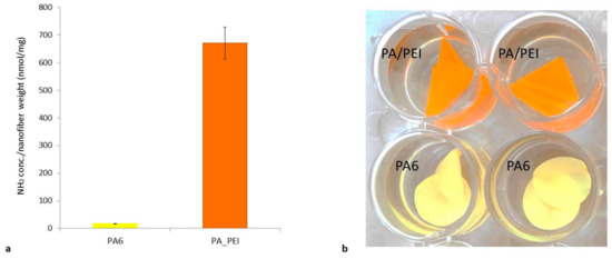 Quantification of available amino groups of polyamide 6 (PA6) and polyamide 6/polyethylenimine (PA/PEI) nanofibers (a). Color difference according to the amount of methyl orange (MO) attached to the nanofibers (b).
