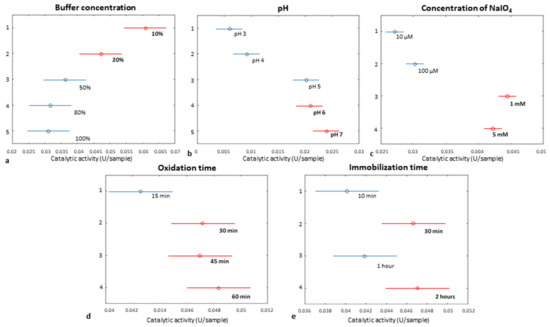 There were statistically significant differences between group means of all studied parameters as determined by one-way ANOVA (buffer concentration: F(4.20) = 16.69, p = 3.68 × 10−6; pH: F(4.20) = 50.95, p = 3.28 × 10−10; concentration of NaIO4: F(3,16) = 148.76, p = 6.77 × 10−12; oxidation time: F(3,16) = 4.85, p = 0.0138; immobilization time: F(3,16) = 5.13, p = 0.0112). Figure 4 illustrates the best results based on the multiple comparison test.