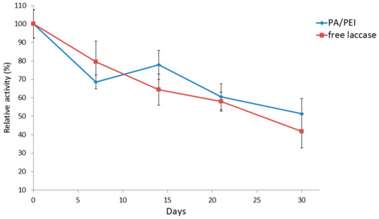Storage stability of free and immobilized laccase. PA/PEI nanofibers loaded with immobilized laccase were incubated deionized water at 4 °C. Free laccase solution was stored under the same conditions for comparison with the immobilized laccase.