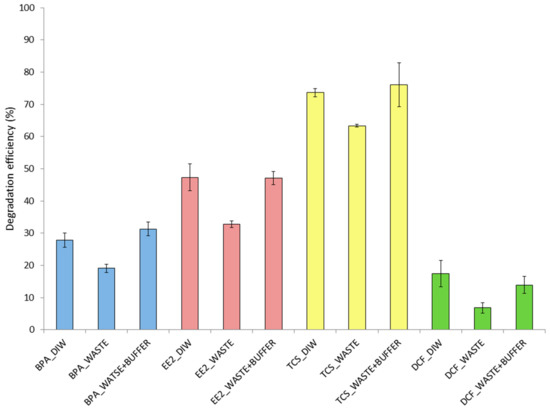 Degradation efficiency of immobilized laccase (PA/PEI-laccase) towards a mixture of 10 mg/mL of bisphenol A (BPA), 17α-ethinylestradiol (EE2), triclosan (TCS), and diclofenac (DCF), in deionized water (DIW), wastewater effluent (WASTE), and wastewater infused with 2.5% (v/v) of McIlvaine’s buffer of pH 7 (WASTE + BUFFER).
