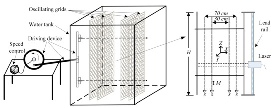 Turbulence exists widely in river, coastal and ocean environments. Shear-free turbulence is a crucial building block in understanding the fundamental turbulence mechanisms and particle–turbulence interactions. For many decades, shear-free turbulence has been generated in laboratory using different methods. The first way appears to be with a mean flow passing through a grid or mesh in tunnels [1], while such generated turbulence decays rapidly, resulting in small observation time and limited practical utility. As alternatives, researchers have employed a water tank in which the flow is stirred by means of oscillating grids [2,3,4,5,6,7,8,9,10], loudspeaker cones [11,12,13], rotating elements [14] or synthetic jets [15,16,17,18,19]. The oscillating grid turbulence (OGT) exhibits fine homogeneity in planes parallel to the grid and can be easily controlled by varying the operational parameters. Since Rouse (1939) first used OGT to study sediment suspension [20], the OGT was employed to explore the mechanics of the sediment transport [21,22], the interfacial mixing in stratified flows [2,23], the mass transfer across a shear-free water–air interface [24,25], the desorption of contaminants from sediment [26,27], the rate of frazil ice growth [28] and the turbulent thermal diffusion effect [6]. With so many application experiences, despite the emergence of the alternative loudspeaker and jet approaches which are relatively expensive, the OGT was still widely used in recent years [5,29,30,31,32,33,34].