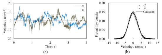 Turbulence is a random process but with statistical regularity, and the velocities of OGT should agree with the Gaussian distribution [3]. The instantaneous flow velocities and their probability density distributions in the middle of the measurement plane are shown in Figure 3. It can be seen that both the longitudinal and vertical velocities are random processes and are well approximated by Gaussian distribution with Skewness and Kurtoses values being 0.1 and 2.42 for U, −0.3 and 2.68 for W, respectively.