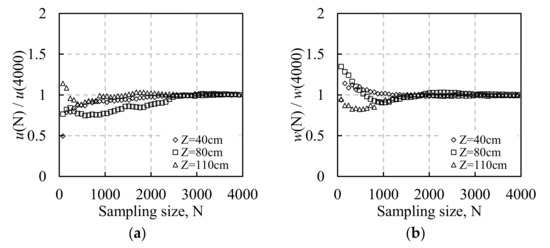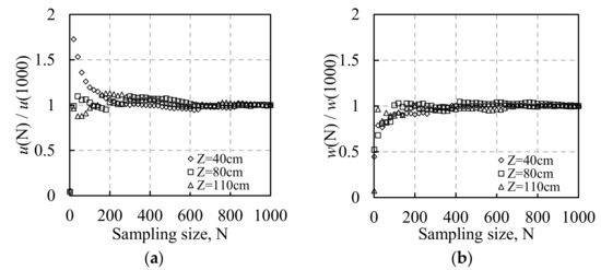 To investigate whether the averaging time is long enough to be able to statistically analyze the flow characteristics, the measurement results of the two sampling methods are examined. The horizontal and vertical RMS velocity fluctuations at three specific elevations are nondimensionalized and presented in Figure 4 and Figure 5.