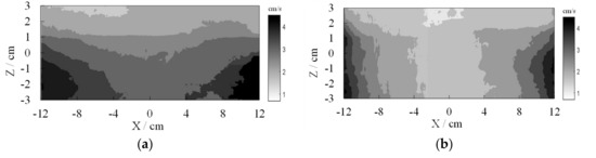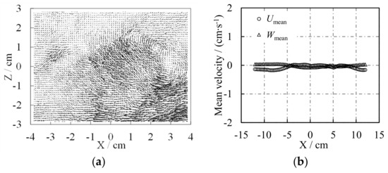 Distribution of the measured flow velocity when s = 0.5 cm and f = 3 Hz: (a) instantaneous velocity field of zone B2; (b) mean velocity along the X direction.