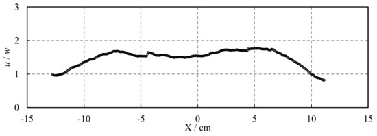 Usually, u was always smaller than w by the vertical oscillating grid in previous studies, and a ratio of u/w being 0.8–0.9 was obtained. Comparatively, the advantage of this study is that a relatively stable ratio of u/w being 1.5–2.0 in the core region (−4 cm < X < 4 cm) is obtained as shown in Figure 8, which agrees with those measured in open-channel flows [42]. The result indicates that the turbulent intensity level in the oscillating direction is always bigger than that in other directions, and the horizontal oscillating grid may be more appropriate when studying the fundamental turbulent mechanisms in open-channel flows.