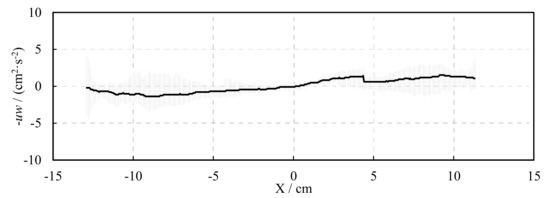 The spatial distribution of the Reynolds stress (−uw) along the X direction is shown in Figure 9, each vertical line in the figure represents the biggest variation amplitude of Reynolds stress at the Y direction. It can be seen that the Reynolds stresses deviate from zero near the grids and the variations are also relatively big, while the turbulence is nearly shear-free with small variations at the core region of the water tank (−4 cm < X < 4 cm).
