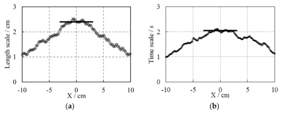 where fl and ft are spatial and time correlation functions r and τ are space and time intervals and L and T are integral length and time scales. The integral length scale is linearly proportional to the distance from the grid for the oscillating grid turbulence generated by a single grid [37,46]. Using a pair of grids, Srdic et al. (1996) and Shy et al. (1997) found that the integral length scale was almost constant in the central region of the water tank [39,40], while Schulz et al. (2006) suggested a combination of two linear trends for the upper and lower sides between the grids [7]. In this study, both the longitudinal and vertical length scales are first calculated at each distance from the grid, then the total integral length scale L is obtained using the previously used method [7]. Figure 10a shows the distributions of L, indicating that the integral length scale is about 2.4 cm in the core of the two internal grids and decreases away linearly from the core. Additionally, the calculated integral length scale is consistent with the eddy size in Figure 6a. Hannoun (1988) stated that the integral time scale increases linearly with the distance from the grid [3], and Shy et al. (1997) suggested a nearly constant value in the core region [40]. Figure 10b shows the distributions of T, illustrating that the integral time scale is about 2 s in the core of the two internal grids and decreases away from the core. Thus, the integral velocity scale in the core region of the water tank is about 1.2 cm/s, which is consistent with the magnitude of turbulent intensity level.