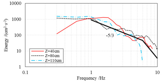 Based on the measurements of the sampling frequency of 1000 Hz, the frequency spectra at the core of the two internal grids are presented in Figure 11. It can be seen that all the frequency spectra in the inertial subrange at different elevations exhibit a slope of −5/3, obeying Kolmogorov’s theory.