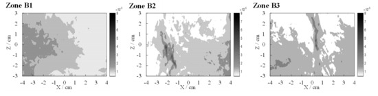 The RMS velocities of two components at zone A2-B2-C2 are shown in Figure 7. Results indicate that the RMS velocities near the grids are relatively big, and decay with the increasing distance from the grid, then become constant near the core region of the water tank (−4 cm < X < 4 cm), consistent with the previous results by using a pair of oscillating girds [7,40].