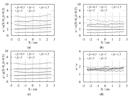 Turbulent intensity level (nondimensionalized using their reference values at X = 0, fs = 0.5 cm/s) under different strokes and frequencies: (a) u component; (b) w component; (c) q; (d) u/w.