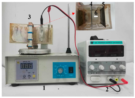 Electrocoagulation (EC) experimental set-up: (1) Magnetic stirrer; (2) DC power supply; (3) electrolytic cell; (4) anode plate; (5) cathode plate; (6) magnetic bar-stirrer.