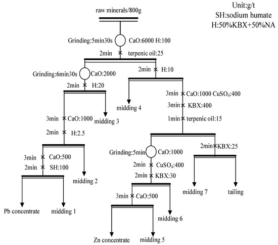 Fresh water, wastewater, and treated water were then used for flotation at room temperature. The whole process can be divided into two stages: Galena flotation followed by sphalerite flotation. For each flotation experiment, an 800 g ore sample was ground by a conical ball mill to obtain a product of 85 wt.% passing 74 μm. After grinding, the ore pulp was transferred to the galena flotation stage, including single-stage roughing, three-stage cleaning, and single-stage scavenging. The tailing of galena flotation was used later for sphalerite flotation, where single-stage roughing, two-stage cleaning, and single-stage scavenging were adopted. In both flotation stages, the concentrates of roughing were reground to 80 wt.% passing 44 μm in a Φ150 × 100 conical mill. According to the existing process of the beneficiation plant, sequential addition of regulator, collector, and frother to the flotation cell were carried out, as shown in Figure 2. After flotation, the products were dried, weighed, and assayed, and then the recovery was calculated on the basis of the mass and metal balance, as shown in Equation (7).
