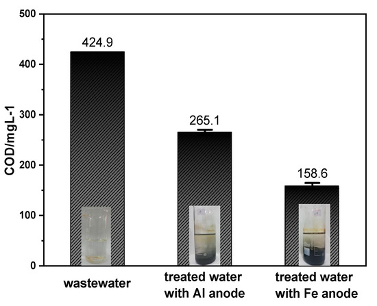 Unlike anode materials, cathode materials do not have a significant effect on EC efficiency except in electro-Fenton processes [15]. We have learned that stainless steel is the most widely-used cathode material in industry, considering its economy and durability [16]. In addition, the distance between the anode and cathode is suggested to be 1~2 cm, according to previous publications and industrial experience [17]. After verification, 2 cm was the optimal distance to be adopted in our following experiments. As the anode material is a prime consideration for EC technique [18], iron and aluminum plates were used as anode materials in this study. The results of COD removal efficiency with the two anode materials are shown in Figure 3. When using an iron electrode, the COD value decreases from 424.9 to 158.6 mg/L, which is equivalent to a removal rate of 62.7%. However, when an aluminum anode is used, the COD value is reduced to 265.1 mg/L, corresponding to a removal rate of 37.7%. The results indicate that in this study, Fe performs better as the anode material of the EC process. Therefore, an Fe anode was adopted in the subsequent experiments.