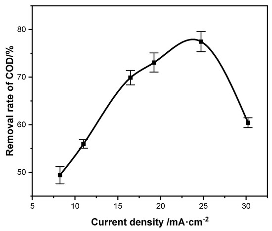 Current density is another important parameter that determines the amount of coagulant produced in the reactor [19]. It has a significant effect on the EC efficiency and electricity consumption. The experimental results are summarized in Figure 4. Figure 4 shows that COD removal rate first increases and then declines with the increase of current density. COD removal rate increases from 49.41% to 77.46% as the current density rises to 24.73 mA/cm2. Then, it decreases to 60.42% as the current density continues to increase to 30.22 mA/cm2. The current density is related to the amount of dissolved iron ions and the formation of Fe(OH)3, which determines the COD removal efficiency [20]. It can also affect the cell voltage through various overpotentials, which may be conducive to the removal efficiency of the COD. If the current density is relatively low, the lack of coagulant may restrict the removal efficiency. Therefore, the curve presents an upward trend at an early stage. However, when the current density continues to increase to 32.22 mA/cm2, the temperature of treated wastewater increases significantly. High temperature causes the instability of coagulation, which can lead to a low EC efficiency. Furthermore, energy consumption grows gradually with the increase of current density [21]. Taking both the COD removal rate and electricity consumption into account, 19.23 mA/cm2 was used as the current density for subsequent experiments.