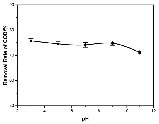To evaluate the effect of the initial pH, the wastewater samples were adjusted to a preset pH value using sodium hydroxide or sulfuric acid. The effects of initial pH value on COD removal rate are shown in Figure 5. The results show that the COD removal rate in the EC process remains around 75.0% in a wide pH value range from 3 to 9. However, when the initial pH increases to 11, the removal efficiency presents a downward trend with a corresponding removal rate of 71.08%; this is probably because of the formation of soluble Fe(OH)−4, which is not conducive to the floc formation. On the contrary, at a neutral or acidic pH, higher removal rates occur as most of the iron complexes are formed. Hence, subsequent experiments were carried out under neutral pH conditions. pH 7.1 was employed in the following experiments.