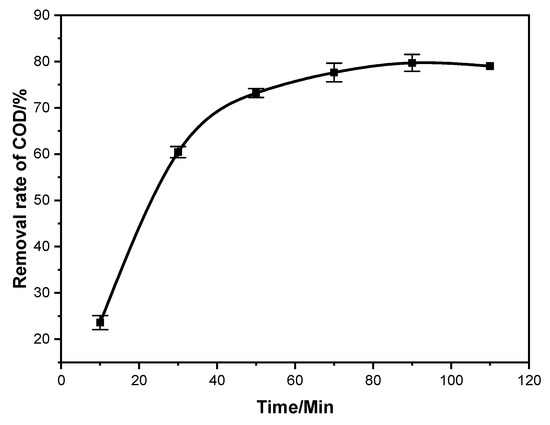 Electrolysis time is another important parameter affecting COD removal efficiency [22]. The results of the effect of electrolysis time on the COD removal rate are provided in Figure 6. Figure 6 shows that the COD removal rate increases rapidly in the initial phase, which is due to the increase of coagulant; yet, the growth trend of the COD removal rate gradually slows down with the extension of electrolysis time. When electrolysis time increases to 70 min, the COD removal rate reaches a plateau at 77.62% because the adsorption of organic pollutants reaches an equilibrium state. The electrolysis time of subsequent experiments was set to be 70 min.