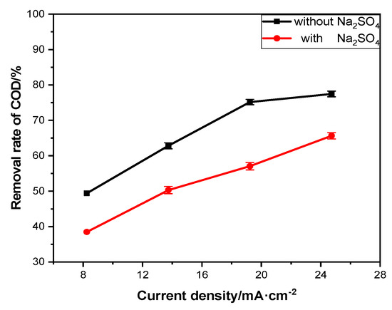Under the same current density, an increase of supporting electrolyte concentration can lead to a decrease of the interelectrode resistance and thus reduce energy consumption. Ghernaout reported that the addition of a supporting electrolyte can also affect the removal rate of COD [23]. Hence, the effect of supporting electrolyte concentration on EC efficiency was further studied in this study, and Na2SO4 was chosen as the supporting electrolyte because of its low cost. The Na2SO4 concentration of 1.0, 1.1, 1.2, and 1.3 g/L corresponded to the current densities of 8.24, 13.74, 19.23, and 24.73 mA/cm2, respectively. The results of the effect of Na2SO4 addition on the COD removal rate are shown in Figure 7. The removal rates with the addition of Na2SO4 are much lower than those without Na2SO4. No positive effect on COD removal efficiency is observed by the addition of Na2SO4, which is consistent with previous reports [24]. The low removal efficiency can be attributed to the increase of the passivation layer caused by the addition of Na2SO4 [25].