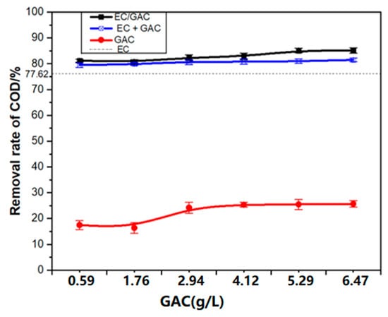 Activated carbon is widely used to adsorb organic compounds in wastewater [26]. In order to study the effect of activated carbon on the COD removal efficiency with EC, wastewater samples were treated by GAC adsorption, EC/GAC adsorption (EC plus GAC in one reactor), and EC + GAC adsorption (EC followed by GAC in different reactors) process, and their results are summarized in Figure 8.