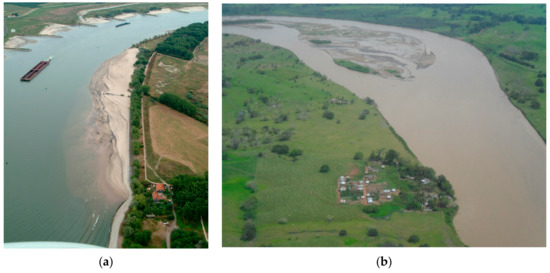 (a) Rhine River, the Netherlands. Point bar inside a river bend, forced by channel curvature, hinders navigation. Flow direction from top to bottom. (b) Cauca River, Colombia. Compound central bar forced by a local width expansion. Flow direction from bottom to top.